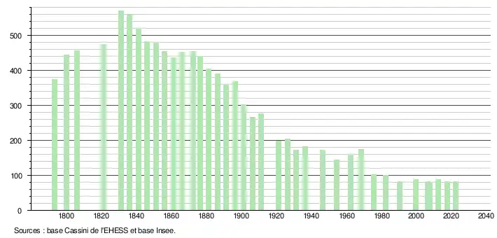 L'évolution du nombre d'habitants est connue à travers les recensements de la population effectués dans la commune depuis 1793. Pour les communes de moins de 10 000 habitants, une enquête de recensement portant sur toute la population est réalisée tous les cinq ans, les populations de référence des années intermédiaires étant quant à elles estimées par interpolation ou extrapolation[19]. Pour la commune, le premier recensement exhaustif entrant dans le cadre du nouveau dispositif a été réalisé en 2007[20].