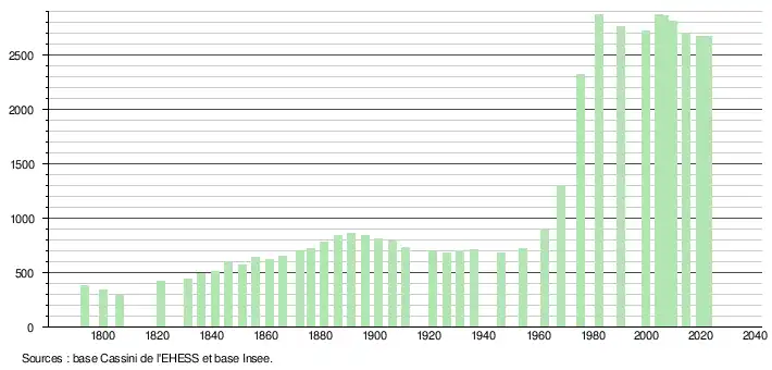 L'évolution du nombre d'habitants est connue à travers les recensements de la population effectués dans la commune depuis 1793. Pour les communes de moins de 10 000 habitants, une enquête de recensement portant sur toute la population est réalisée tous les cinq ans, les populations de référence des années intermédiaires étant quant à elles estimées par interpolation ou extrapolation[29]. Pour la commune, le premier recensement exhaustif entrant dans le cadre du nouveau dispositif a été réalisé en 2004[30].