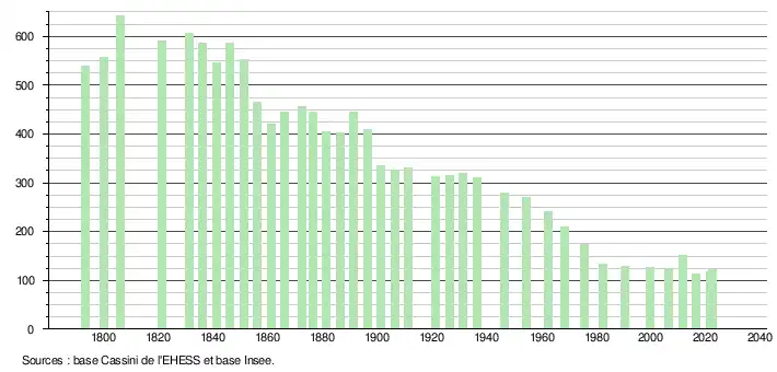 L'évolution du nombre d'habitants est connue à travers les recensements de la population effectués dans la commune depuis 1793. Pour les communes de moins de 10 000 habitants, une enquête de recensement portant sur toute la population est réalisée tous les cinq ans, les populations de référence des années intermédiaires étant quant à elles estimées par interpolation ou extrapolation[14]. Pour la commune, le premier recensement exhaustif entrant dans le cadre du nouveau dispositif a été réalisé en 2006[15].