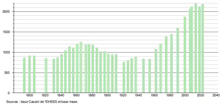 L'évolution du nombre d'habitants est connue à travers les recensements de la population effectués dans la commune depuis 1793. Pour les communes de moins de 10 000 habitants, une enquête de recensement portant sur toute la population est réalisée tous les cinq ans, les populations de référence des années intermédiaires étant quant à elles estimées par interpolation ou extrapolation[22]. Pour la commune, le premier recensement exhaustif entrant dans le cadre du nouveau dispositif a été réalisé en 2008[23].
