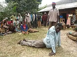 Châtiment corporel public infligé à un homme pour sa mauvaise conduite, dans un village d'Ouganda.