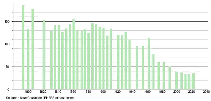 L'évolution du nombre d'habitants est connue à travers les recensements de la population effectués dans la commune depuis 1793. Pour les communes de moins de 10 000 habitants, une enquête de recensement portant sur toute la population est réalisée tous les cinq ans, les populations de référence des années intermédiaires étant quant à elles estimées par interpolation ou extrapolation[30]. Pour la commune, le premier recensement exhaustif entrant dans le cadre du nouveau dispositif a été réalisé en 2006[31].