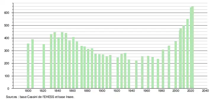 L'évolution du nombre d'habitants est connue à travers les recensements de la population effectués dans la commune depuis 1800. Pour les communes de moins de 10 000 habitants, une enquête de recensement portant sur toute la population est réalisée tous les cinq ans, les populations de référence des années intermédiaires étant quant à elles estimées par interpolation ou extrapolation[19]. Pour la commune, le premier recensement exhaustif entrant dans le cadre du nouveau dispositif a été réalisé en 2005[20].