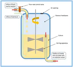 Un chémostat (contraction de "environnement chimique qui reste statique") est un bioréacteur dans lequel du milieu frais est ajouté en continu, tandis que le liquide de culture contenant les nutriments restants, les produits finaux métaboliques et les micro-organismes est éliminé en continu à la même vitesse pour maintenir le volume de culture constant[2],[3]. En modifiant la vitesse à laquelle le milieu est ajouté au bioréacteur, la vitesse de croissance spécifique du micro-organisme peut être facilement contrôlée dans certaines limites.