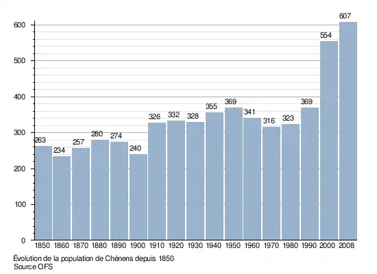 Le graphique suivant résume l'évolution de la population de Chénens entre 1850 et 2008[6] :