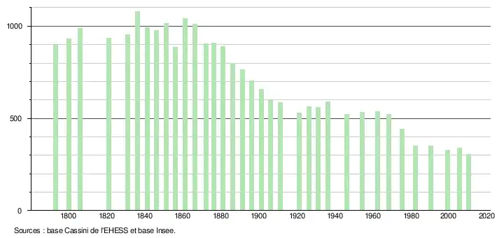 - ↑ Par convention dans Wikipédia, le principe a été retenu de n’afficher dans le tableau des recensements et le graphique, pour les populations légales postérieures à 1999, que les populations correspondant à une enquête exhaustive de recensement pour les communes de moins de 10 000 habitants, et que les populations des années 2006, 2011, 2016, etc. pour les communes de plus de 10 000 habitants, ainsi que la dernière population légale publiée par l’Insee pour l'ensemble des communes.