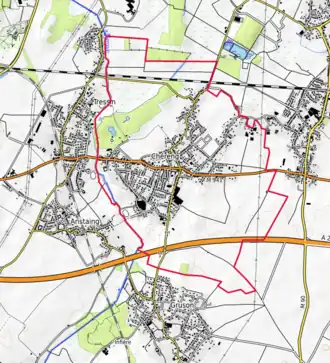 L'occupation des sols de la commune, telle qu'elle ressort de la base de données européenne d'occupation biophysique des sols Corine Land Cover (CLC), est marquée par l'importance des territoires agricoles (66,6 % en 2018), en diminution par rapport à 1990 (69,6 %). La répartition détaillée en 2018 est la suivante : terres arables (37,3 %), prairies (29,2 %), zones urbanisées (27,5 %), forêts (5,9 %)[18]. L'évolution de l'occupation des sols de la commune et de ses infrastructures peut être observée sur les différentes représentations cartographiques du territoire : la carte de Cassini (XVIIIe siècle), la carte d'état-major (1820-1866) et les cartes ou photos aériennes de l'IGN pour la période actuelle (1950 à aujourd'hui)[Carte 3].