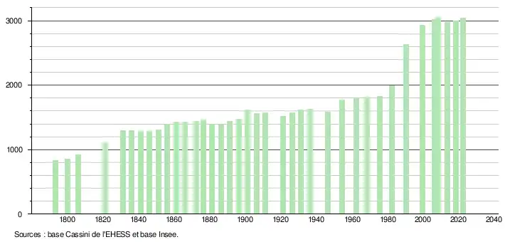 L'évolution du nombre d'habitants est connue à travers les recensements de la population effectués dans la commune depuis 1793. Pour les communes de moins de 10 000 habitants, une enquête de recensement portant sur toute la population est réalisée tous les cinq ans, les populations de référence des années intermédiaires étant quant à elles estimées par interpolation ou extrapolation[28]. Pour la commune, le premier recensement exhaustif entrant dans le cadre du nouveau dispositif a été réalisé en 2008[29].