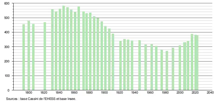 L'évolution du nombre d'habitants est connue à travers les recensements de la population effectués dans la commune depuis 1793. Pour les communes de moins de 10 000 habitants, une enquête de recensement portant sur toute la population est réalisée tous les cinq ans, les populations de référence des années intermédiaires étant quant à elles estimées par interpolation ou extrapolation[25]. Pour la commune, le premier recensement exhaustif entrant dans le cadre du nouveau dispositif a été réalisé en 2005[26].