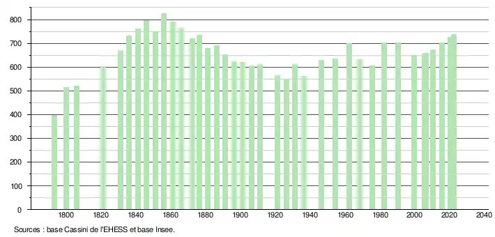 L'évolution du nombre d'habitants est connue à travers les recensements de la population effectués dans la commune depuis 1793. Pour les communes de moins de 10 000 habitants, une enquête de recensement portant sur toute la population est réalisée tous les cinq ans, les populations de référence des années intermédiaires étant quant à elles estimées par interpolation ou extrapolation[23]. Pour la commune, le premier recensement exhaustif entrant dans le cadre du nouveau dispositif a été réalisé en 2005[24].
