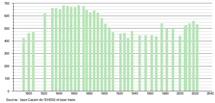 L'évolution du nombre d'habitants est connue à travers les recensements de la population effectués dans la commune depuis 1793. Pour les communes de moins de 10 000 habitants, une enquête de recensement portant sur toute la population est réalisée tous les cinq ans, les populations de référence des années intermédiaires étant quant à elles estimées par interpolation ou extrapolation[17]. Pour la commune, le premier recensement exhaustif entrant dans le cadre du nouveau dispositif a été réalisé en 2007[18].