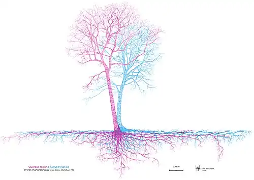- ↑ Transversalement, la racine ligneuse comporte deux parties : le périderme foncé par les cellules contenant des tanins (brunissement tannique), et le cylindre central. En raison de la plus grande production de xylème, le cylindre central est dominé par des rayons de xylème secondaire disposés radialement entrecoupés de rayons médullaires de cellules du parenchyme. Les cernes de croissance annuels du bois de printemps et d'été sont difficiles à distinguer dans les racines.