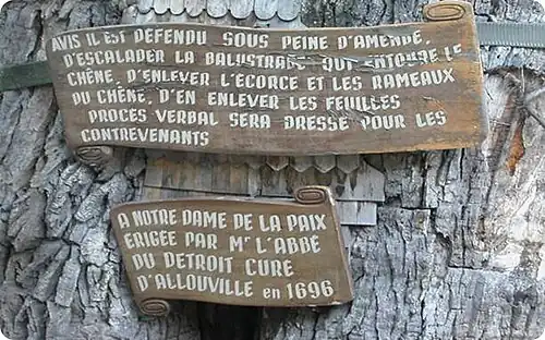 L'abbé Jacques Delalande du Détroit, alors curé d'Allouville à la fin du XVIIe siècle, recouvre avec de l'essente toutes les crevasses du chêne. Il construit, avec du bardeau, un petit clocher surmonté d'une croix de fer qui s'élève au-dessus du feuillage. Ce clocher, qui figure sur la gravure d'Eustache-Hyacinthe Langlois, ne subsiste plus aujourd'hui. Dans la partie intérieure du tronc, il glisse dans le creux de l'arbre une image de la vierge et invite les paroissiens à venir prier pour la paix et dédia l'arbre à Notre-Dame-de-la-Paix, comme il est encore possible de le lire sur la porte de la cellule : « Érigée par M. l'abbé du Détroit, curé d'Allouville, en l'année 1696 »[25].