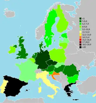 En , le taux de chômage des jeunes (moins de 25 ans) s’est établi à 21,4 % dans l’Union européenne et à 23,0 % dans la zone euro, contre respectivement 23,1 % et 23,9 % en . Il s’agit du taux le plus bas enregistré pour l’Union européenne depuis et pour la zone euro depuis . Les taux les plus bas en ont été observés en Allemagne (7,2 %), en Autriche (9,0 %) ainsi qu’aux Pays-Bas (9,6 %), et les plus élevés en Espagne (51,4 %), en Grèce (50,6 % en ), en Croatie (44,8 % au quatrième trimestre 2014) et en Italie (42,0%). La France se trouve légèrement au-dessus de la moyenne avec 25,2 %[2].