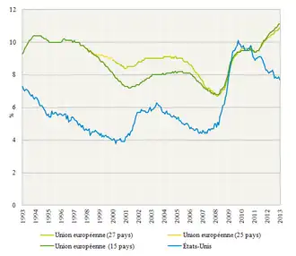 Le retour à une croissance même relativement incertaine a permis aux États-Unis d'enregistrer ensuite une décrue du chômage qui atteint désormais moins de 8 %[5]. Bien que souvent jugé limité ce recul fait ressortir par différence la dégradation de la situation dans l'Union européenne où sous l'effet d'une croissance atone et de mesures restrictives, le chômage continue de progresser, plusieurs pays connaissant un chômage de masse.