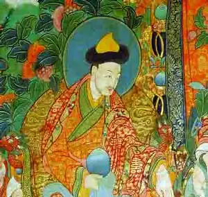 Lobsang Gyatso (1617-1682) « le Grand Cinquième ». Il bénéficiait de puissants protecteurs mongol (Güshri Khan) et mandchou (Shunzhi) |