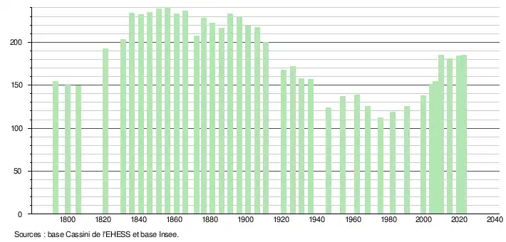 L'évolution du nombre d'habitants est connue à travers les recensements de la population effectués dans la commune depuis 1793. Pour les communes de moins de 10 000 habitants, une enquête de recensement portant sur toute la population est réalisée tous les cinq ans, les populations de référence des années intermédiaires étant quant à elles estimées par interpolation ou extrapolation[14]. Pour la commune, le premier recensement exhaustif entrant dans le cadre du nouveau dispositif a été réalisé en 2004[15].