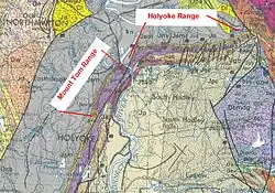 La chaîne Mount Tom s'est formée il y a 200 millions d'années au cours du Trias et du Jurassique et se compose de basalte, une roche volcanique effusive de couleur sombre qui vire au brun-rouille lorsque le fer qu'elle contient s'oxyde au contact de l'air. Les intrusions de basalte sont généralement de forme octogonale ou pentagonale et produisent des formations appelées « orgues basaltiques ». De vastes talus composés d'éboulis basaltiques issus de l'érosion sont visibles au pied de nombreuses falaises, en particulier au mont Tom, au White Peak et au Deadtop, le long de la route de la Mount Tom State Reservation ou du Metacomet-Monadnock Trail sur les crêtes[6]. Les crêtes basaltiques sont le résultat d'une série de coulées de lave massives, d'une centaine de mètres d'épaisseur, qui se sont échappées par des failles créées lors de la séparation de la Laurasia et du Gondwana, puis de l'Amérique du Nord et de l'Eurasie. Les émissions de lave se sont déroulées durant 20 millions d'années[6].