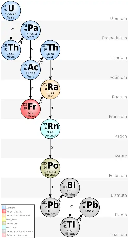 Celui-ci, très instable (une demi-vie de 0,1 ms), subit une désintégration α qui lui fait rejoindre la branche principale sur le bismuth 211. - Le bismuth 211 subit une désintégration β− dans 0,276 % des cas, conduisant au polonium 211, (d'une demi-vie de 0,516 s). Ce dernier se désintègre en plomb 207, stable, par une décroissance α.