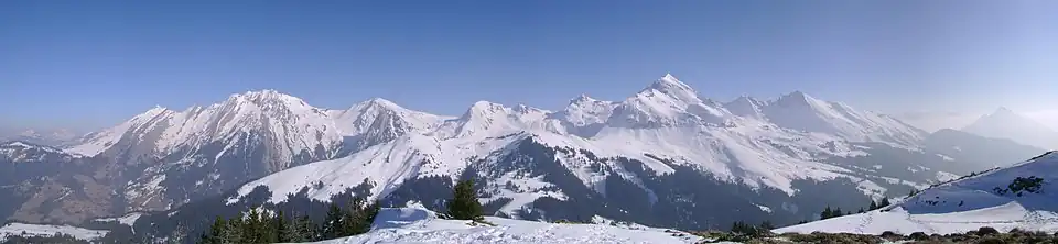 La chaîne des Aravis est une chaîne de montagnes située dans les Préalpes à cheval entre la Haute-Savoie (versant ouest) et la Savoie (versant est). Son plus haut sommet est la pointe Percée (2 750 m) que se partagent les communes du Grand-Bornand, de Sallanches et du Reposoir. L'extrémité septentrionale du massif est appelée chaîne du Reposoir[1],[2].