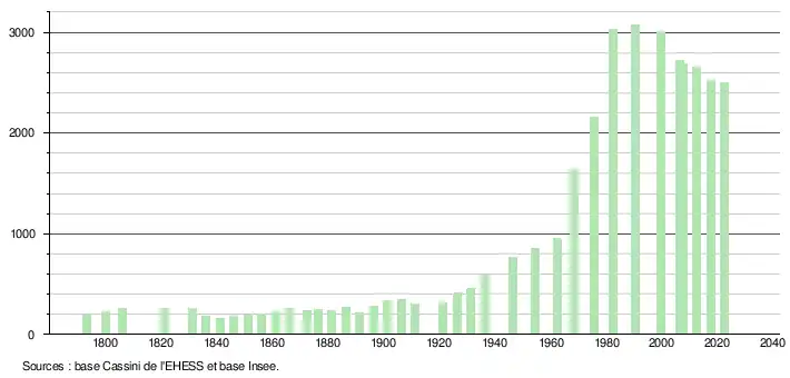 L'évolution du nombre d'habitants est connue à travers les recensements de la population effectués dans la commune depuis 1793. Pour les communes de moins de 10 000 habitants, une enquête de recensement portant sur toute la population est réalisée tous les cinq ans, les populations de référence des années intermédiaires étant quant à elles estimées par interpolation ou extrapolation[25]. Pour la commune, le premier recensement exhaustif entrant dans le cadre du nouveau dispositif a été réalisé en 2007[26].