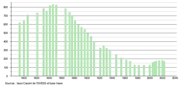 L'évolution du nombre d'habitants est connue à travers les recensements de la population effectués dans la commune depuis 1793. Pour les communes de moins de 10 000 habitants, une enquête de recensement portant sur toute la population est réalisée tous les cinq ans, les populations de référence des années intermédiaires étant quant à elles estimées par interpolation ou extrapolation[16]. Pour la commune, le premier recensement exhaustif entrant dans le cadre du nouveau dispositif a été réalisé en 2004[17].