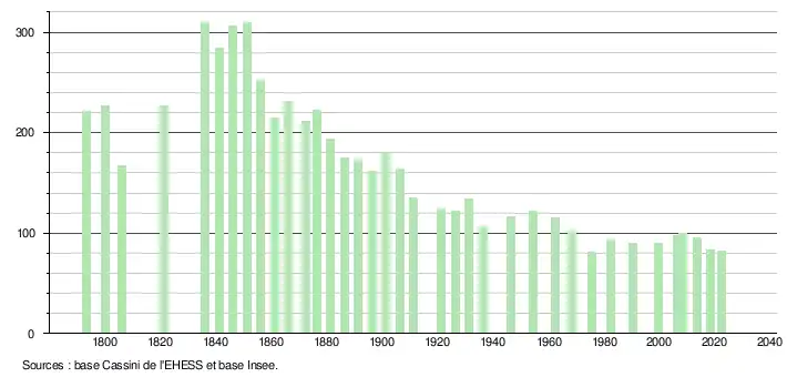 L'évolution du nombre d'habitants est connue à travers les recensements de la population effectués dans la commune depuis 1793. Pour les communes de moins de 10 000 habitants, une enquête de recensement portant sur toute la population est réalisée tous les cinq ans, les populations de référence des années intermédiaires étant quant à elles estimées par interpolation ou extrapolation[28]. Pour la commune, le premier recensement exhaustif entrant dans le cadre du nouveau dispositif a été réalisé en 2008[29].