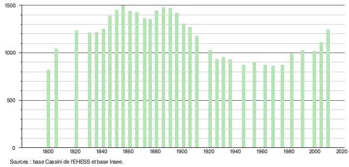L'évolution du nombre d'habitants est connue à travers les recensements de la population effectués dans la commune depuis 1800. À partir du , les populations légales des communes sont publiées annuellement dans le cadre d'un recensement qui repose désormais sur une collecte d'information annuelle, concernant successivement tous les territoires communaux au cours d'une période de cinq ans. Pour les communes de moins de 10 000 habitants, une enquête de recensement portant sur toute la population est réalisée tous les cinq ans, les populations légales des années intermédiaires étant quant à elles estimées par interpolation ou extrapolation[7]. Pour la commune, le premier recensement exhaustif entrant dans le cadre du nouveau dispositif a été réalisé en 2004[8],[Note 2].