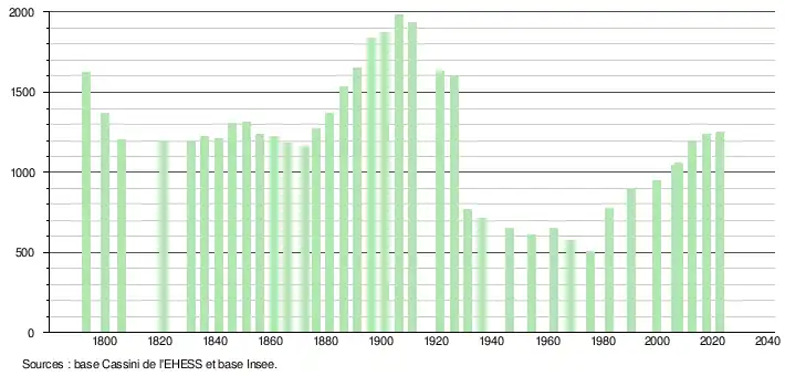 L'évolution du nombre d'habitants est connue à travers les recensements de la population effectués dans la commune depuis 1793. Pour les communes de moins de 10 000 habitants, une enquête de recensement portant sur toute la population est réalisée tous les cinq ans, les populations de référence des années intermédiaires étant quant à elles estimées par interpolation ou extrapolation[29]. Pour la commune, le premier recensement exhaustif entrant dans le cadre du nouveau dispositif a été réalisé en 2007[30].