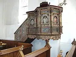 La chaire est constituée[3] de la cuve[4] qui constitue la place du prédicateur, et parfois d'un dossier qui à l'arrière relie la cuve à la partie supérieure appelée abat-voix[5].