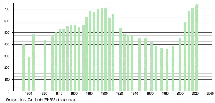 L'évolution du nombre d'habitants est connue à travers les recensements de la population effectués dans la commune depuis 1793. Pour les communes de moins de 10 000 habitants, une enquête de recensement portant sur toute la population est réalisée tous les cinq ans, les populations de référence des années intermédiaires étant quant à elles estimées par interpolation ou extrapolation[16]. Pour la commune, le premier recensement exhaustif entrant dans le cadre du nouveau dispositif a été réalisé en 2006[17].