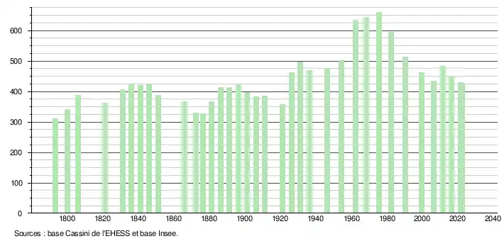 L'évolution du nombre d'habitants est connue à travers les recensements de la population effectués dans la commune depuis 1793. Pour les communes de moins de 10 000 habitants, une enquête de recensement portant sur toute la population est réalisée tous les cinq ans, les populations de référence des années intermédiaires étant quant à elles estimées par interpolation ou extrapolation[23]. Pour la commune, le premier recensement exhaustif entrant dans le cadre du nouveau dispositif a été réalisé en 2006[24].
