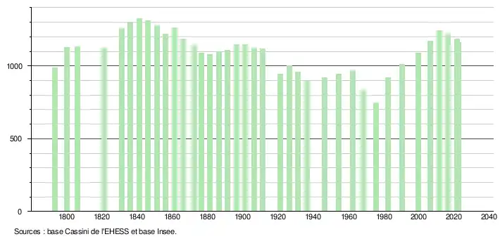 L'évolution du nombre d'habitants est connue à travers les recensements de la population effectués dans la commune depuis 1793. Pour les communes de moins de 10 000 habitants, une enquête de recensement portant sur toute la population est réalisée tous les cinq ans, les populations de référence des années intermédiaires étant quant à elles estimées par interpolation ou extrapolation[16]. Pour la commune, le premier recensement exhaustif entrant dans le cadre du nouveau dispositif a été réalisé en 2006[17].