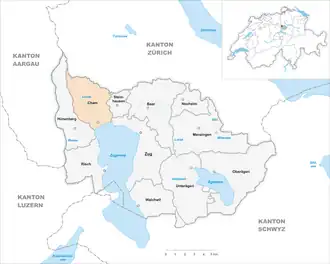 Cham est limitrophe de Hünenberg, Zoug, Steinhausen, Knonau et Maschwanden.