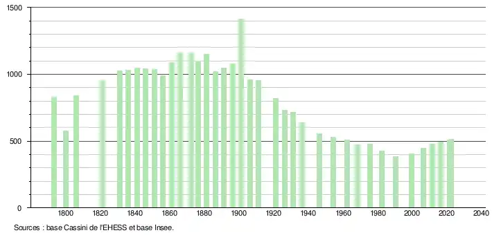 L'évolution du nombre d'habitants est connue à travers les recensements de la population effectués dans la commune depuis 1793. Pour les communes de moins de 10 000 habitants, une enquête de recensement portant sur toute la population est réalisée tous les cinq ans, les populations de référence des années intermédiaires étant quant à elles estimées par interpolation ou extrapolation[22]. Pour la commune, le premier recensement exhaustif entrant dans le cadre du nouveau dispositif a été réalisé en 2006[23].