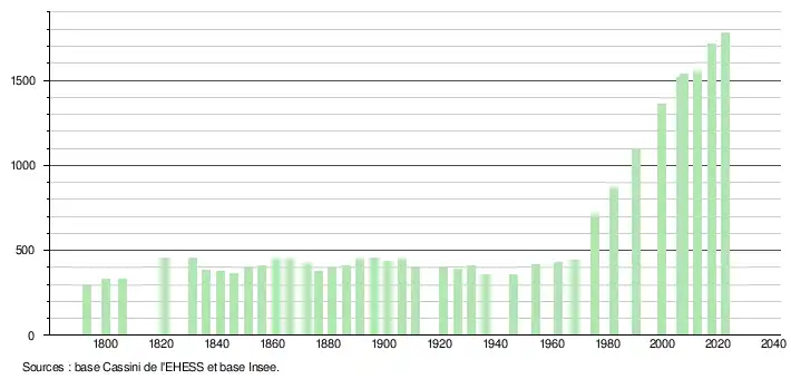 L'évolution du nombre d'habitants est connue à travers les recensements de la population effectués dans la commune depuis 1793. Pour les communes de moins de 10 000 habitants, une enquête de recensement portant sur toute la population est réalisée tous les cinq ans, les populations de référence des années intermédiaires étant quant à elles estimées par interpolation ou extrapolation[18]. Pour la commune, le premier recensement exhaustif entrant dans le cadre du nouveau dispositif a été réalisé en 2007[19].