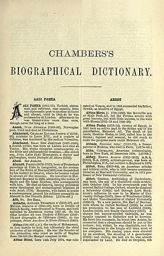 - (en) Cet article est partiellement ou en totalité issu de l’article de Wikipédia en anglais intitulé « Chambers Biographical Dictionary » (voir la liste des auteurs).