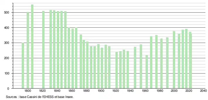 L'évolution du nombre d'habitants est connue à travers les recensements de la population effectués dans la commune depuis 1793. Pour les communes de moins de 10 000 habitants, une enquête de recensement portant sur toute la population est réalisée tous les cinq ans, les populations de référence des années intermédiaires étant quant à elles estimées par interpolation ou extrapolation[23]. Pour la commune, le premier recensement exhaustif entrant dans le cadre du nouveau dispositif a été réalisé en 2006[24].