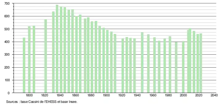L'évolution du nombre d'habitants est connue à travers les recensements de la population effectués dans la commune depuis 1793. Pour les communes de moins de 10 000 habitants, une enquête de recensement portant sur toute la population est réalisée tous les cinq ans, les populations de référence des années intermédiaires étant quant à elles estimées par interpolation ou extrapolation[12]. Pour la commune, le premier recensement exhaustif entrant dans le cadre du nouveau dispositif a été réalisé en 2008[13].