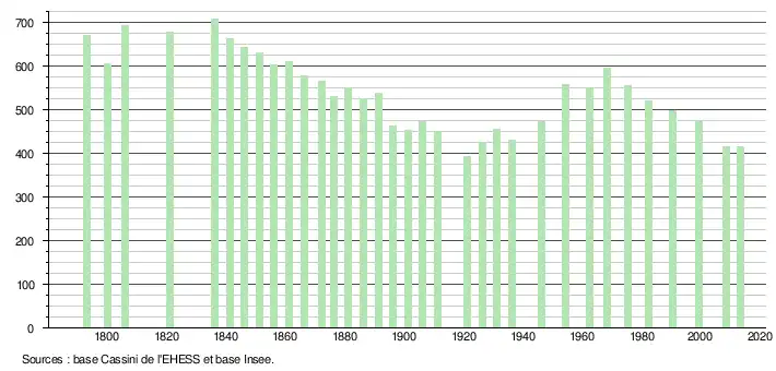 L'évolution du nombre d'habitants est connue à travers les recensements de la population effectués dans la commune depuis 1793. À partir du , les populations légales des communes sont publiées annuellement dans le cadre d'un recensement qui repose désormais sur une collecte d'information annuelle, concernant successivement tous les territoires communaux au cours d'une période de cinq ans. Pour les communes de moins de 10 000 habitants, une enquête de recensement portant sur toute la population est réalisée tous les cinq ans, les populations légales des années intermédiaires étant quant à elles estimées par interpolation ou extrapolation[24]. Pour la commune, le premier recensement exhaustif entrant dans le cadre du nouveau dispositif a été réalisé en 2008[25],[Note 2].