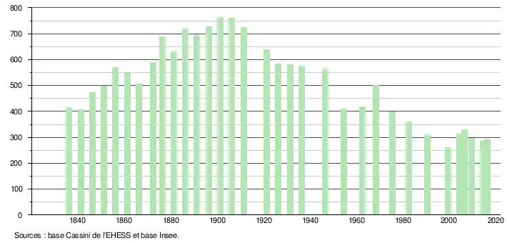 L'évolution du nombre d'habitants est connue à travers les recensements de la population effectués dans la commune depuis 1836. Pour les communes de moins de 10 000 habitants, une enquête de recensement portant sur toute la population est réalisée tous les cinq ans, les populations de référence des années intermédiaires étant quant à elles estimées par interpolation ou extrapolation[5]. Pour la commune, le premier recensement exhaustif entrant dans le cadre du nouveau dispositif a été réalisé en 2004[6].