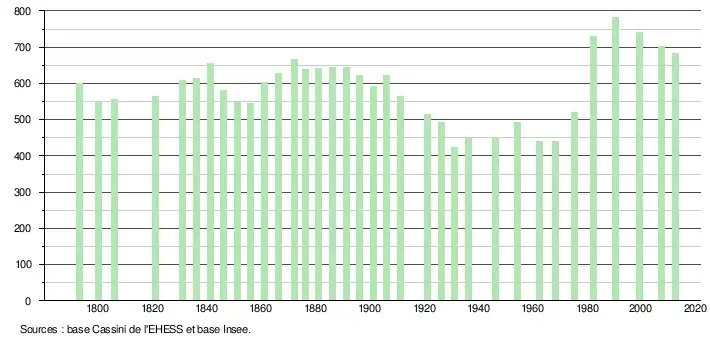 - ↑ Par convention dans Wikipédia, le principe a été retenu de n’afficher dans le tableau des recensements et le graphique, pour les populations légales postérieures à 1999, que les populations correspondant à une enquête exhaustive de recensement pour les communes de moins de 10 000 habitants, et que les populations des années 2006, 2011, 2016, etc. pour les communes de plus de 10 000 habitants, ainsi que la dernière population légale publiée par l’Insee pour l'ensemble des communes.