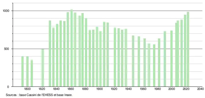 L'évolution du nombre d'habitants est connue à travers les recensements de la population effectués dans la commune depuis 1793. Pour les communes de moins de 10 000 habitants, une enquête de recensement portant sur toute la population est réalisée tous les cinq ans, les populations de référence des années intermédiaires étant quant à elles estimées par interpolation ou extrapolation[14]. Pour la commune, le premier recensement exhaustif entrant dans le cadre du nouveau dispositif a été réalisé en 2008[15].