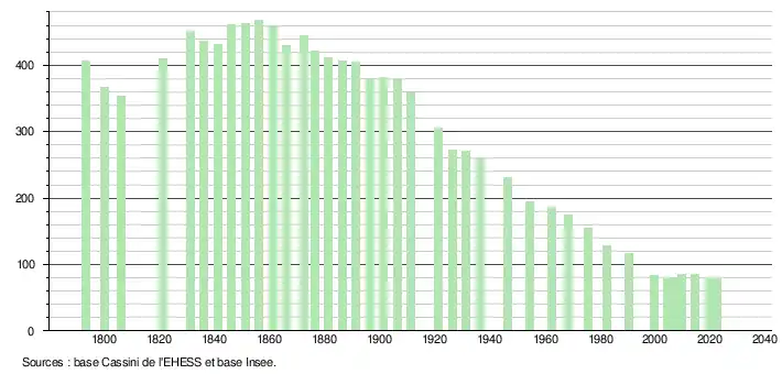 L'évolution du nombre d'habitants est connue à travers les recensements de la population effectués dans la commune depuis 1793. Pour les communes de moins de 10 000 habitants, une enquête de recensement portant sur toute la population est réalisée tous les cinq ans, les populations de référence des années intermédiaires étant quant à elles estimées par interpolation ou extrapolation[21]. Pour la commune, le premier recensement exhaustif entrant dans le cadre du nouveau dispositif a été réalisé en 2004[22].