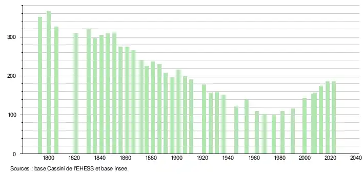 L'évolution du nombre d'habitants est connue à travers les recensements de la population effectués dans la commune depuis 1793. Pour les communes de moins de 10 000 habitants, une enquête de recensement portant sur toute la population est réalisée tous les cinq ans, les populations de référence des années intermédiaires étant quant à elles estimées par interpolation ou extrapolation[20]. Pour la commune, le premier recensement exhaustif entrant dans le cadre du nouveau dispositif a été réalisé en 2007[21].