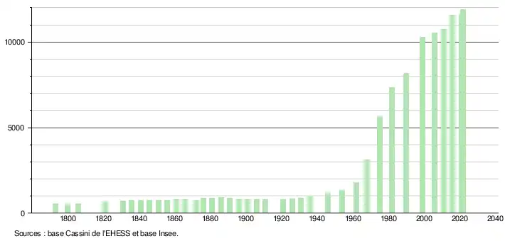 - ↑ Par convention dans Wikipédia, le principe a été retenu de n’afficher dans le tableau des recensements et le graphique, pour les populations de référence postérieures à 1999, que les populations correspondant à une enquête exhaustive de recensement pour les communes de moins de 10 000 habitants, et que les populations des années 2006, 2011, 2016, etc. pour les communes de plus de 10 000 habitants, ainsi que la dernière population de référence publiée par l’Insee pour l'ensemble des communes.