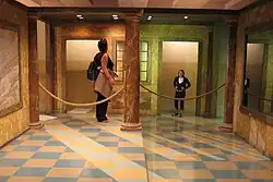 - la pièce apparaît cubique si elle est observée à partir d'un point spécial (la vision doit s'effectuer avec un seul œil, afin d'éliminer l'effet stéréoscopique, en fait elle est trapézoïdale) ;