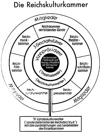 Un intendant de la culture du Reich (Reichskulturwalter) nommé par Goebbels, est chargé notamment de la « déjudaïsation de la vie culturelle allemande ». Ce poste d'intendant est successivement occupé par Hans Schmidt-Leonhardt (de), Franz Moraller (de) et Hans Hinkel.