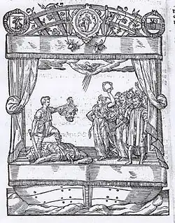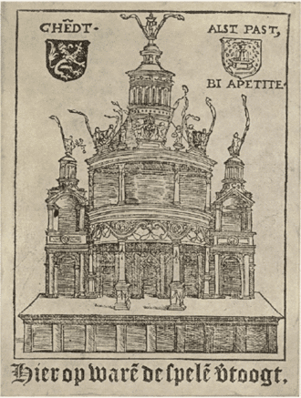 Scène établi pour le célèbre Landjuweel à Anvers en 1561 ; gravure de la publication prestigieuse « Spelen van Sinne, ghespeelt op de Lant juweel binnen Andtwerpen », imprimée en 1562.
