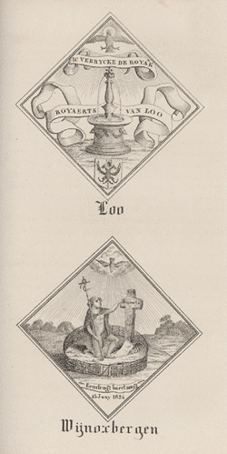 Les blasons des chambres de rhétoriques de Lo et de Bergues, la chambre de Bergues ayant adopté entre-temps la devise Eendraght baert magt (L'unité fait la force).